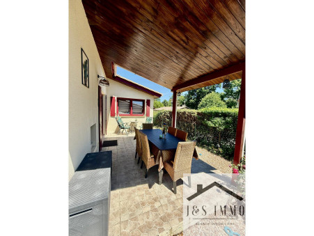 Située dans un village de vacances, cette maison de vacances vous offre 80m² habitables. Elle comporte une entrée avec placard, pièce de vie lumineuse avec cuisine équipée, poêle à granulés et accès à la terrasse couverte, trois chambres, salle d'eau et WC séparé