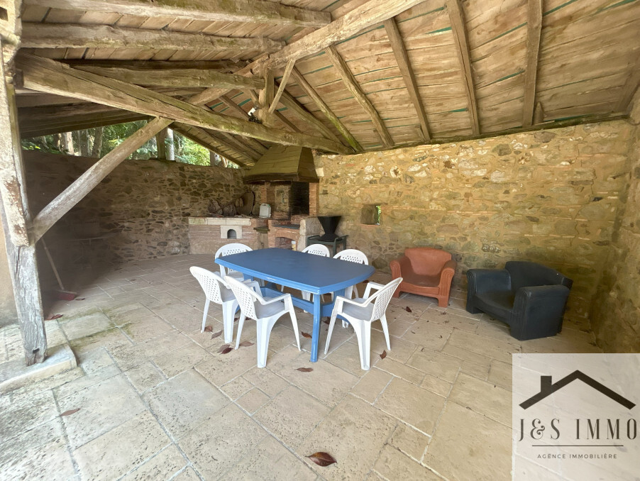 A l'extérieur : Agréable jardin de 5900m² avec de nombreux arbres matures, grange avec une ancienne habitation à restaurer, agréable terrasse couverte, et présence de puits