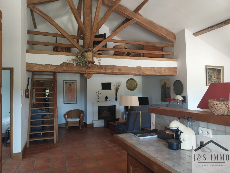 Au RDC : Carrelage partout ; Entrée carrelé (4.2m2~) avec bel escalier d'origine, ouverte sur la cuisine moderne et américaine d'env. 11m2 (aménagée et équipée) avec sa cuisinière à bois et jolie cheminée en pierre ; Pièce de Vie 43m2~avec poutres apparentes, cheminée et insert, accès au jardin et Balcon ; Salle d'eau (6.9m2~douche, lavabo et meuble, WC, bidet) ; Arrière Cuisine (20m2) accès au garage.