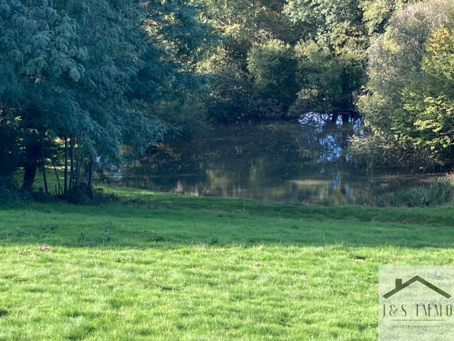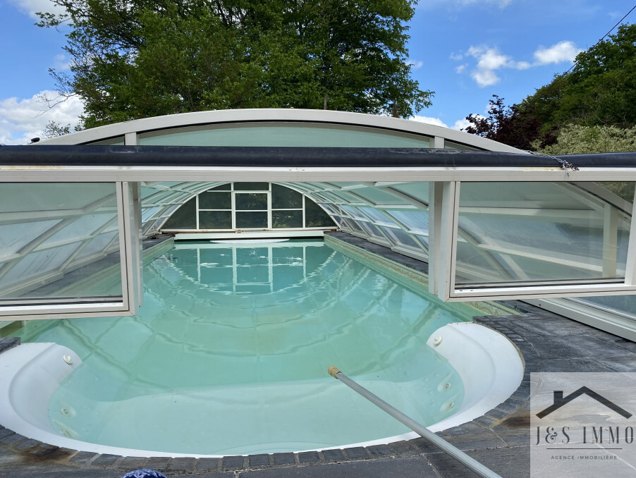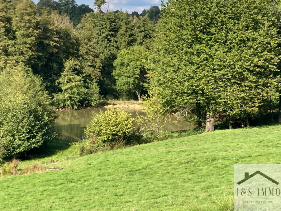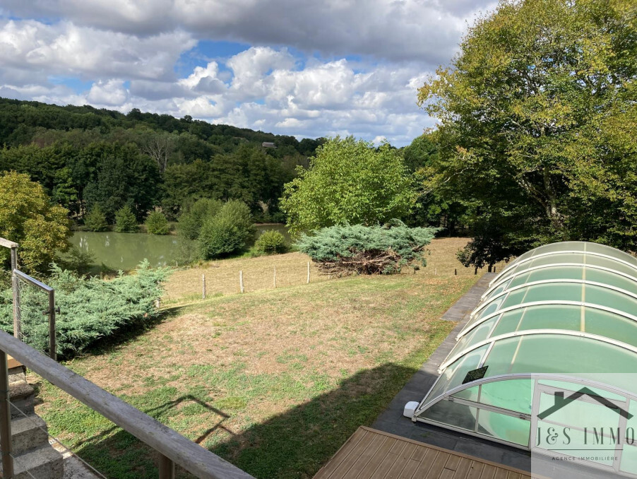 Terrain attenant d'env. 33126m2 ; allée privée ; joli Jardin arboré ; Piscine enterrée, couverte, avec des superbes vues ; espace potager ; pré ; 3 étangs et une parcelle boisée; une partie du terrain est en bordure avec le ruisseau.