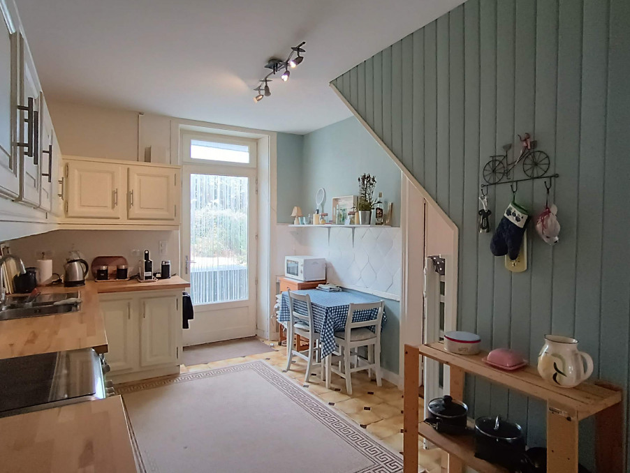 Une cuisine équipée avec portes-fenêtres donnant sur la terrasse, deux autres chambres, l'une avec salle d'eau attenante et l'autre avec lavabo.