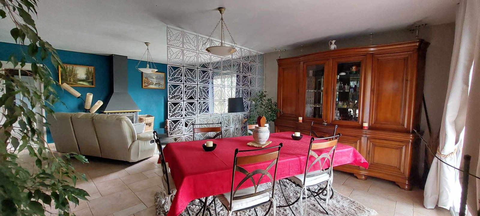 Une vaste pièce de vie baignée de lumière, réunissant salon et salle à manger autour d’un poêle à bois, avec un accès direct à une belle terrasse couverte, idéale pour profiter des extérieurs en toute saison.