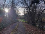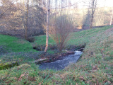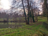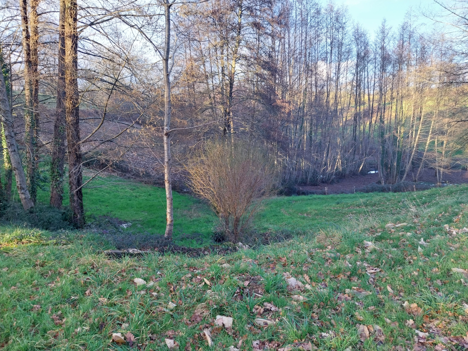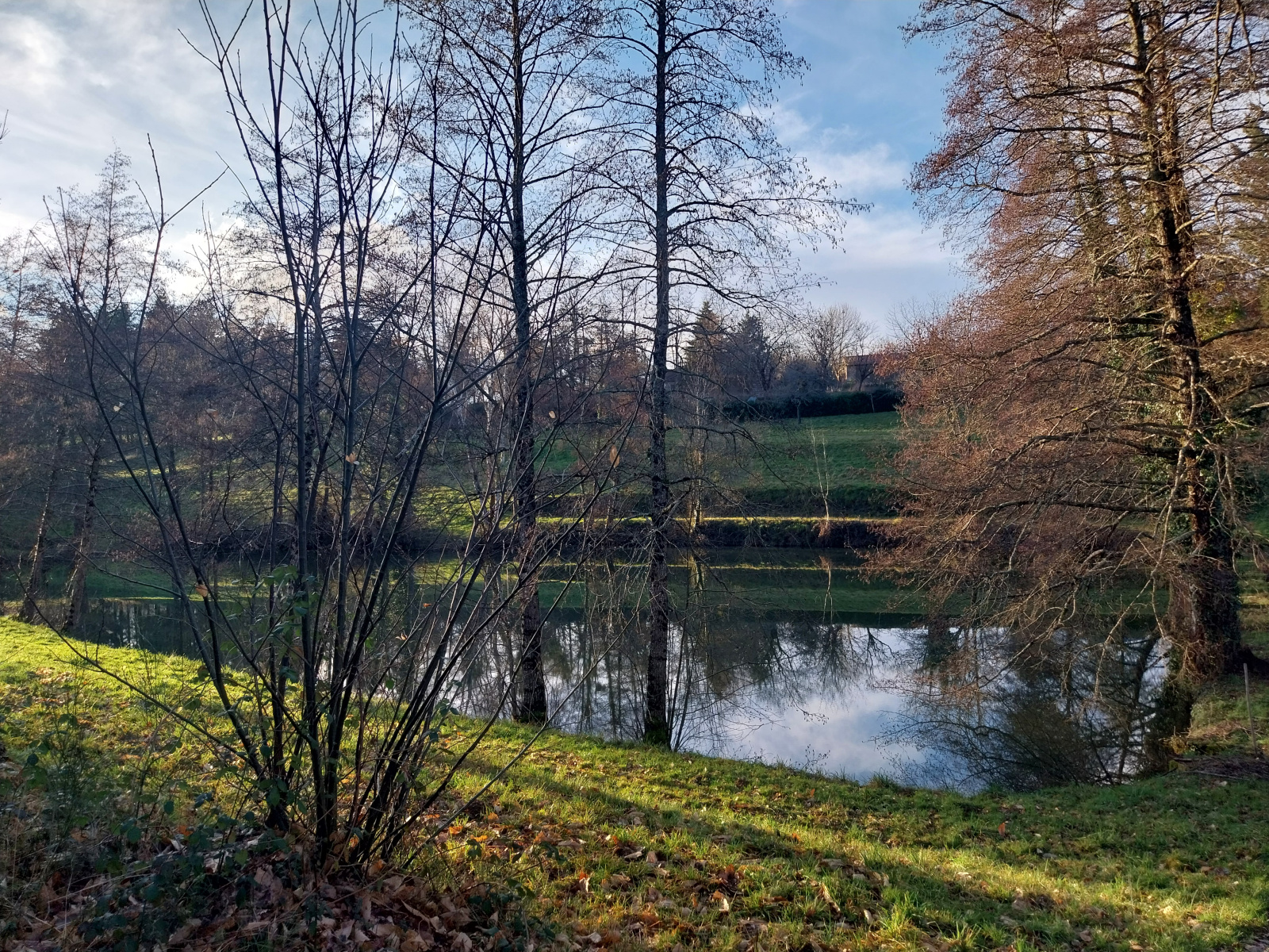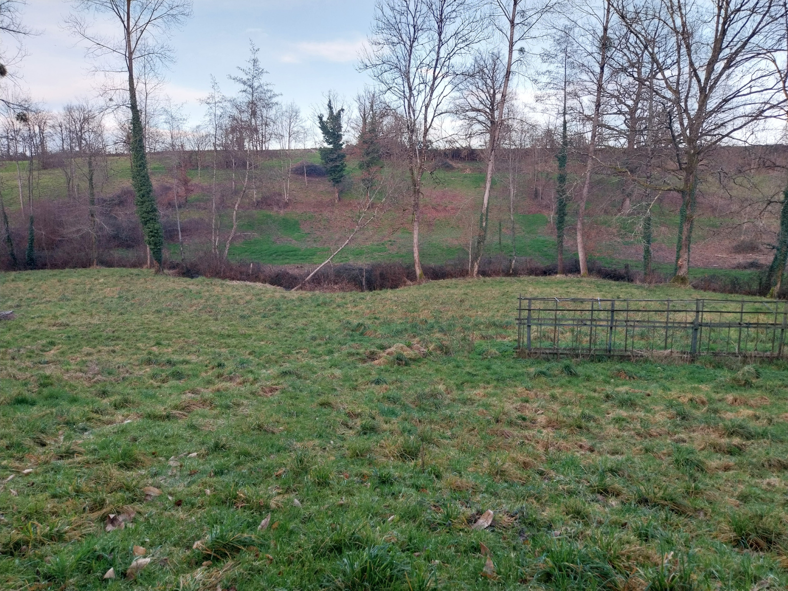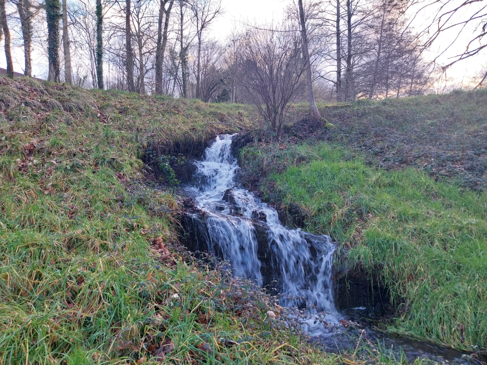 terrain est en bordure avec un ruisseau qu’on peut entendre de la maison. L’allée privée (avec portail) passe par l’étang et la maison jusqu’á un cercle devant le garage/atelier.