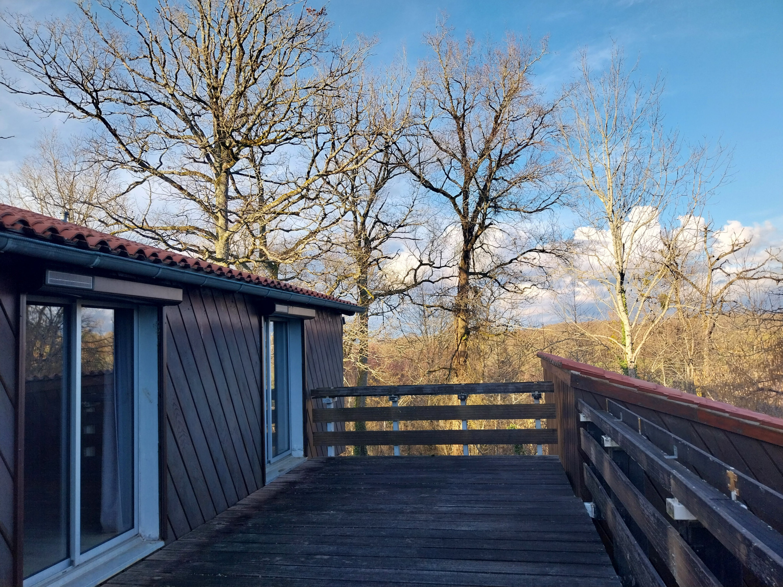 Outbuildings: a few steps from the front door of the house is the fabulous Office which has a floor to ceiling glazed wall with views over the land (14.3m 2 ~tiled & heated with a basin); the balcony doubles as a shady terrace or car port; the driveway extends to a turning circle and large Garagewith height (approx. 49.4m 2 ); large carport/camping car etc 47.2m 2 ; Boiler room/store 24.6m 2Land: approx. 3.3 Ha (8.2 acres), predominately woodland with some grassland and woodplantation and a little lake of approx.600m 2 ( 1/4 Acre); part of the land borders a stream which can beheard from the house. A private, gated driveway passes the lake and winds up to the house whichdominates the surrounding wooded valley and really has views to cherish.