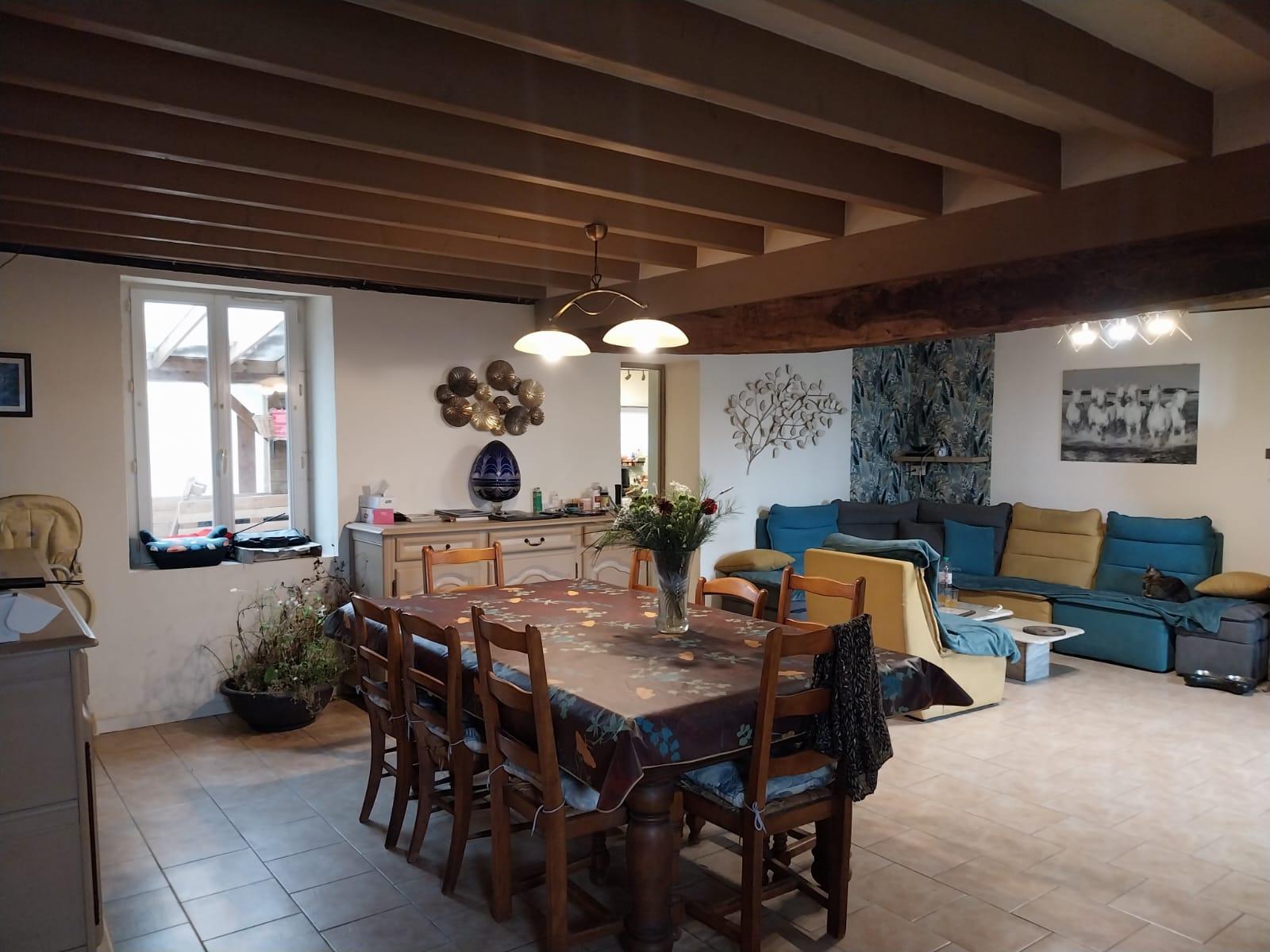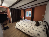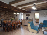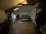 Ce corps de ferme d'une surface habitable de 130m² vous offre une entrée dans pièce de vie spacieuse avec poêle à bois, cuisine aménagée séparée offrant une vue sur le jardin arrière, dégagement avec placard, chambre avec espace rangement, salle de bains avec douche, double vasque et wc séparé
