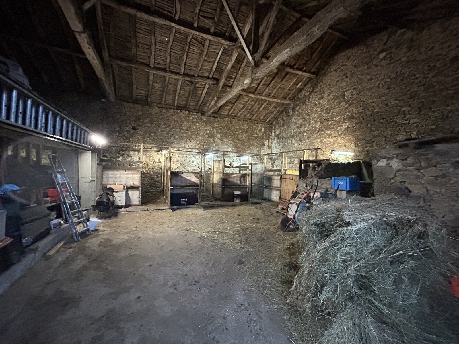 Fabulous, Rural setting for this Equestrian Property with hacking trails directly to the Lakes of theHaute Charente. 4 bed Farmhouse with 2 Barns (5 Boxes); 3.4 Hectares (8.5 Acres) with a registeredSpring and a Sand School.The trails that lead out from this Stone Farmhouse are a bit special you can even hack down to thelakeside; it’s perfect for an equestrian or small farming project.Situation: 16310 Verneuil at the end of a little country lane this group of stone buildings aresurrounded by rolling hills and are walking distance from the lakes of the Haute Charente; there areneighbours but they don’t overlook; 5 minutes from a Village with a Bar-Restaurant, Bakers, Grocers,Doctors, Pharmacy; 15 mins from the Towns of Rochechourt or Chabanais; 50 mins from bothLimoges airport and Angouleme (TGV).Description: The property is a typical French “Corps de Ferme” with stone buildings to 3 sides of acentral courtyard; the 4 bed Farmhouse has approx.130m 2 habitable space laid out as follows:Ground floor: Porch with entrance into the Large Living room (44m 2 ~), tiled with exposed stoneworkand beams, fireplace with wood-burner and stairs to the 1 st Floor; adjacent fitted Kitchen (10.6m 2 ~);Bedroom (19.5m 2 ~) with laminate flooring and large wardrobe; Bathroom (11.3m 2 ~bath, walk-inshower, double basin and separate wc).1 st Floor: Spacious Landing (9.5m 2 ~); all of the rooms have mansard ceilings, exposed beams andslightly more space at floor level than the approx. surface areas suggests: small Office (6m 2 ~);Shower Room (7.5m 2 ~); 3 further Bedrooms (12-13m 2 ~).Outbuildings: 2 Barns approx. 105m 2 and 155m 2 the latter with 5 boxes; Boiler house; 2 lean-to’s.Land: Approx. 34121m 2 (8.5 Acres); attached (with a tractor track running through); Courtyard;Garden; Sand School; Paddocks and pasture bordered with trees.UPVC/wood Double-glazed throughout; wooden shutters and some rolling shutters on the smallerwindows; Heating via pellet burner and rads; 13kw wood burner; 2 electric water heaters (2021);Roof was overhauled in 2007; Fosse septic 2023 - conforming microstation; the property isconnected to mains electricity and phone line but is not connected to mains water – it has its ownwater supply from its own spring. Taxe Fonciere: 1562€/annum Energy: D/183; GHGE A/5